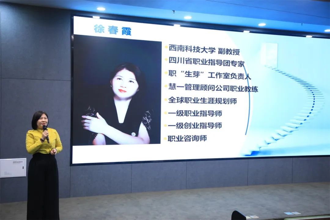 ????活动现场,西南科技大学徐春霞副教授(四川省互联网+职业指导团专家、四川省“点亮生涯”大学生职业生涯规划大赛决赛评委、职“生芽”工作室负责人 )为绵飞院学子开展了职业生涯规划大讲堂,引导树立正确的择业、就业观念,明确奋斗目标,提升就业能力。