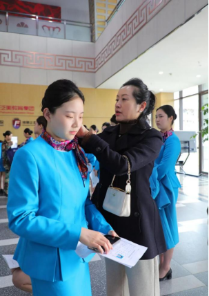 面试开始前,绵阳飞行职业学院副院长、民航服务与管理学院杨桃、就业处处长孙晓萌以及参谋长顾晓露、齐杨等来到现场,帮同学们整理妆发、强调面试要点,为同学们加油打气。