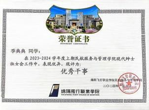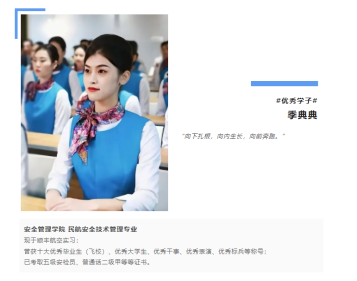 2022年,季典典带着“校园十大优秀毕业生”的荣誉,踏入绵飞院的大门。加入学院绅士淑女会秘书部、担任班级中队长,积极参与校园十大经典活动,考取五级安检员证书、普通话二甲证书……奔走在追梦的路上,她不断给自己“加码”。