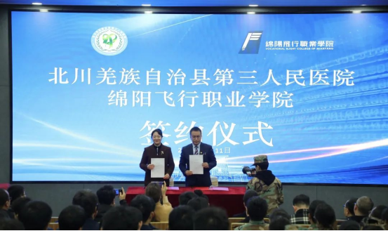 在签约环节,绵阳飞行职业学院执行院长梁国辉分别与北川永昌机场——绵阳科航通用机场管理有限责任公司、四川九洲永昌检测技术服务有限责任公司、北川羌族自治县第三人民医院、四川格斯拉科技有限公司合作单位代表逐一签署校企合作协议。
