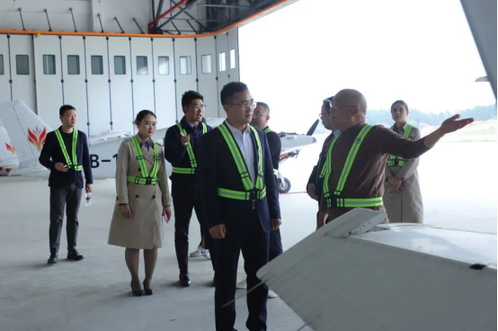 当天下午,双方前往北川通用机场参观?;∠喙馗涸鹑讼晗附樯芰嘶〉脑擞芾?、设施设备及通用航空领域的技术应用。校企双方实地考察了航站楼、机库及实训基地,并就地勤等岗位的实践教学需求展开交流。