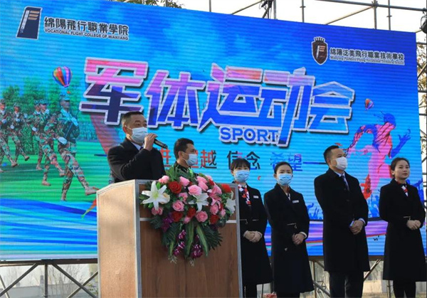 ????绵阳飞行职业学院副院长、绵阳泛美飞行职业技术学校常务副校长鲜继培宣布第三届军体运动会开幕!