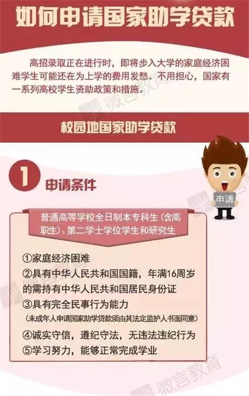 ????历经数年寒窗,很多同学即将步入梦想中的大学校园。此时此刻,你是否担心家庭经济状况无力承担自己的大学学费?不用担心,国家有一系列高校学生资助政策和措施。下面一图带大家了解如何申请国家助学贷款!