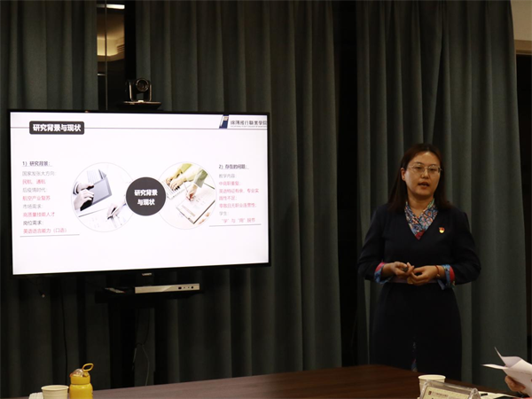 ????齐杨老师就《落实立德树人根本任务背景下航空类高职院校思政课程教学方法改革探索与研究》、《高职院校班级管理策略探究》进行开题陈述。