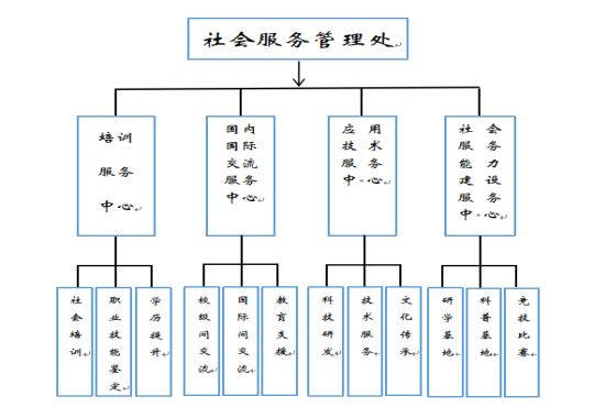 社会服务管理处是在学院的领导下,开展社会服务活动的具体执行部门。下设培训服务中心、国内国际交流服务中心、应用技术服务中心、社会服务能力建设服务中心。各二级学院成立社会服务办公室,接受学院社会服务管理处的业务指导。