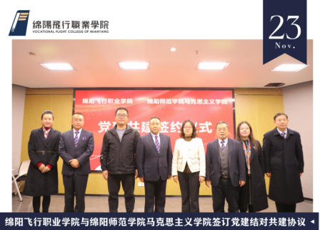 为深入推进校际合作、进一步提升绵阳飞行职业学院党的建设工作质量、加强绵飞院思想政治工作、深入推进绵阳师范学院马克思主义学院党委与绵阳飞行职业学院党支部的交流合作。2023年11月23日,绵阳飞行职业学院、绵阳师范学院马克思主义学院党委党建共建签约仪式暨绵飞院马克思主义学院名誉院长聘任仪式在绵飞院行政楼举行。泛美教育集团副总裁、绵阳飞行职业学院院长李玉龙、党支部书记资建民、副院长梁国辉、李选华、杨桃,绵阳师范学院马克思主义学院党委书记周鹏、院长冯莎、副院长韩晓娟、教工一支部党支部书记邓华、教工二支部党支部书记唐辉、骨干教师杨芳等领导及嘉宾莅临签约仪式现场。签约仪式由绵飞院马克思主义学院副院长齐杨主持。