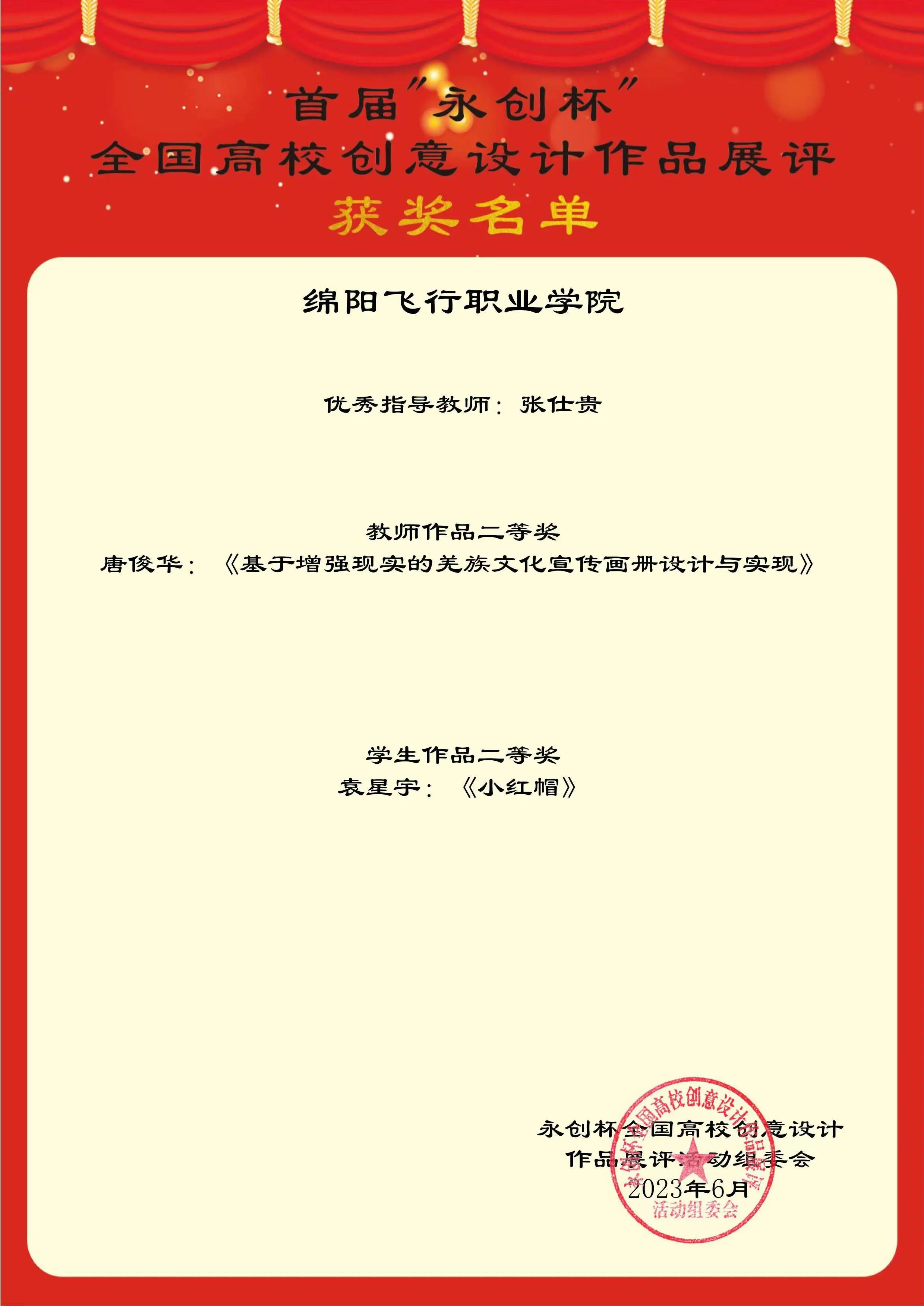 ????近日,首届“永创杯”全国高校创意设计作品征集活动落下帷幕。绵阳飞行职业学院智能科技学院师生在比赛中脱颖而出,喜获佳绩。其中,智科学院教师唐俊华作品《基于增强现实的羌族文化宣传画册设计与实现》获得教师组二等奖、22级数字媒体专业袁星宇同学作品《小红帽》获得学生组二等奖、指导教师张仕贵获得“优秀指导教师”称号。