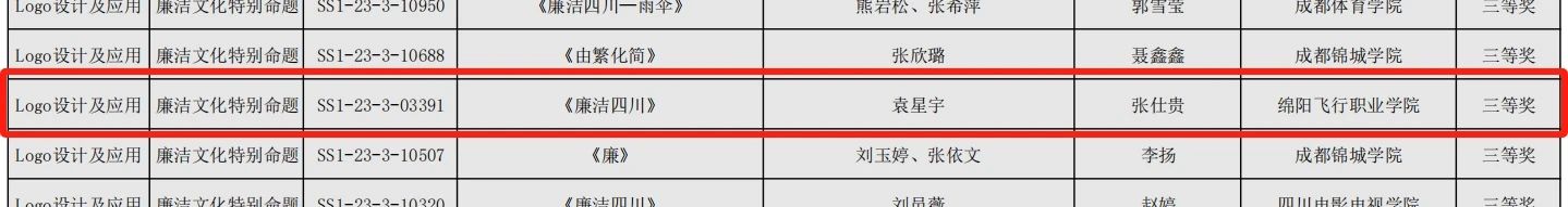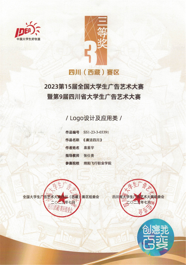 ????又讯:近日,2023第15届全国大学生广告艺术大赛暨第9届四川省大学生广告艺术大赛四川(西藏)赛区评审结果揭晓,绵阳飞行职业学院智能科技学院22级数字媒体专业袁星宇同学作品《廉洁四川》获得Logo设计及应用类三等奖。
