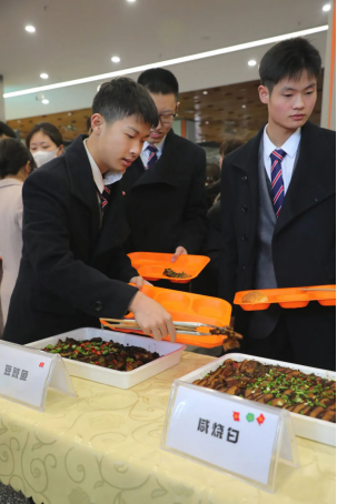 此次选餐会的膳食涵括五湖风味,有独具北川特色泡椒芋丝、富有北方风味的地三鲜、松软可口的西式糕点、飘香十里的烧烤等几十种菜品,赢得现场试吃师生的纷纷点赞。我最喜欢吃的是这个毛血旺,鲜辣咸香,有一种吃小火锅的感觉。”23级休闲体育1班的王帅同学将手中投票贴纸为毛血旺贴上了一票。