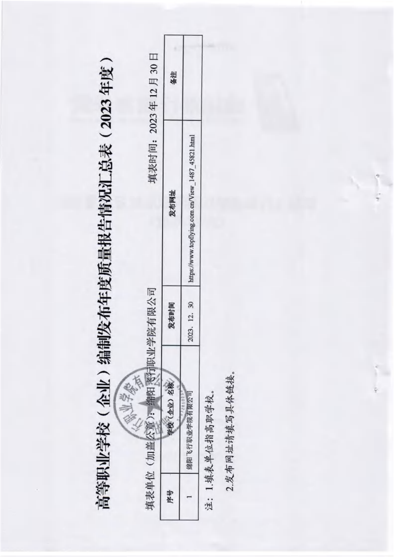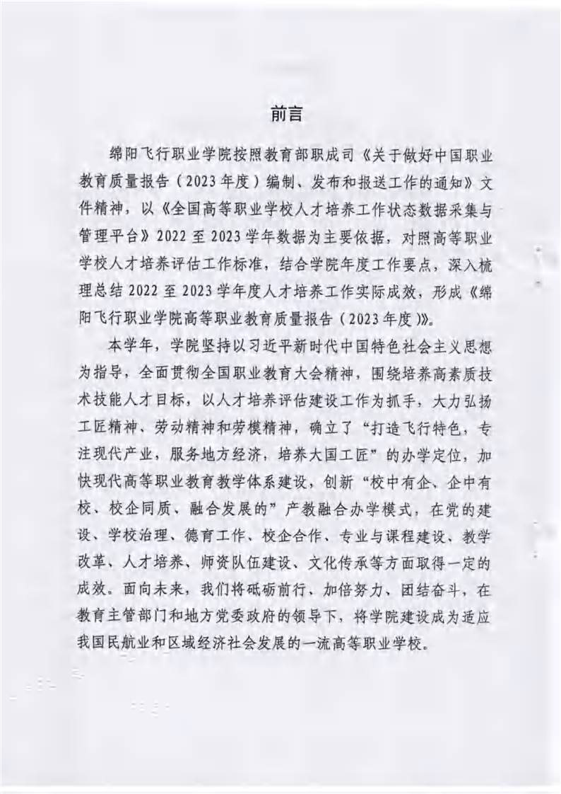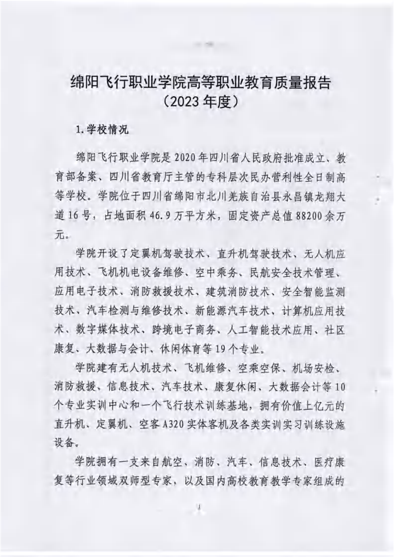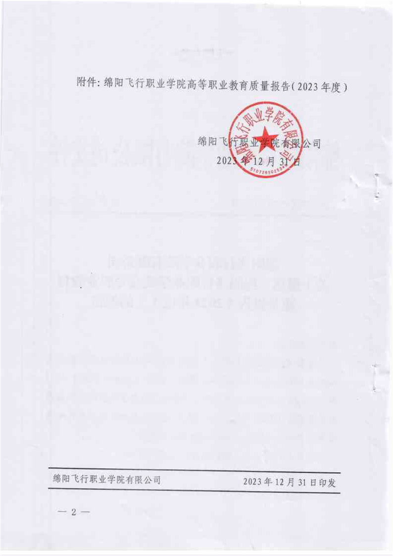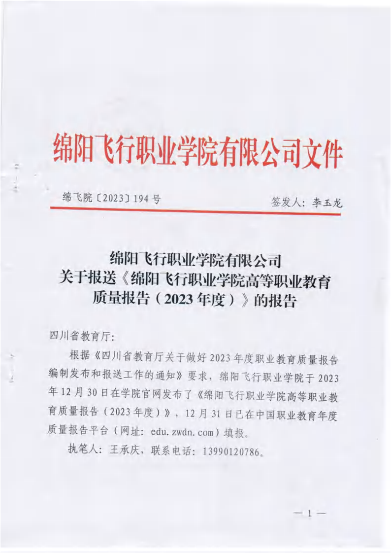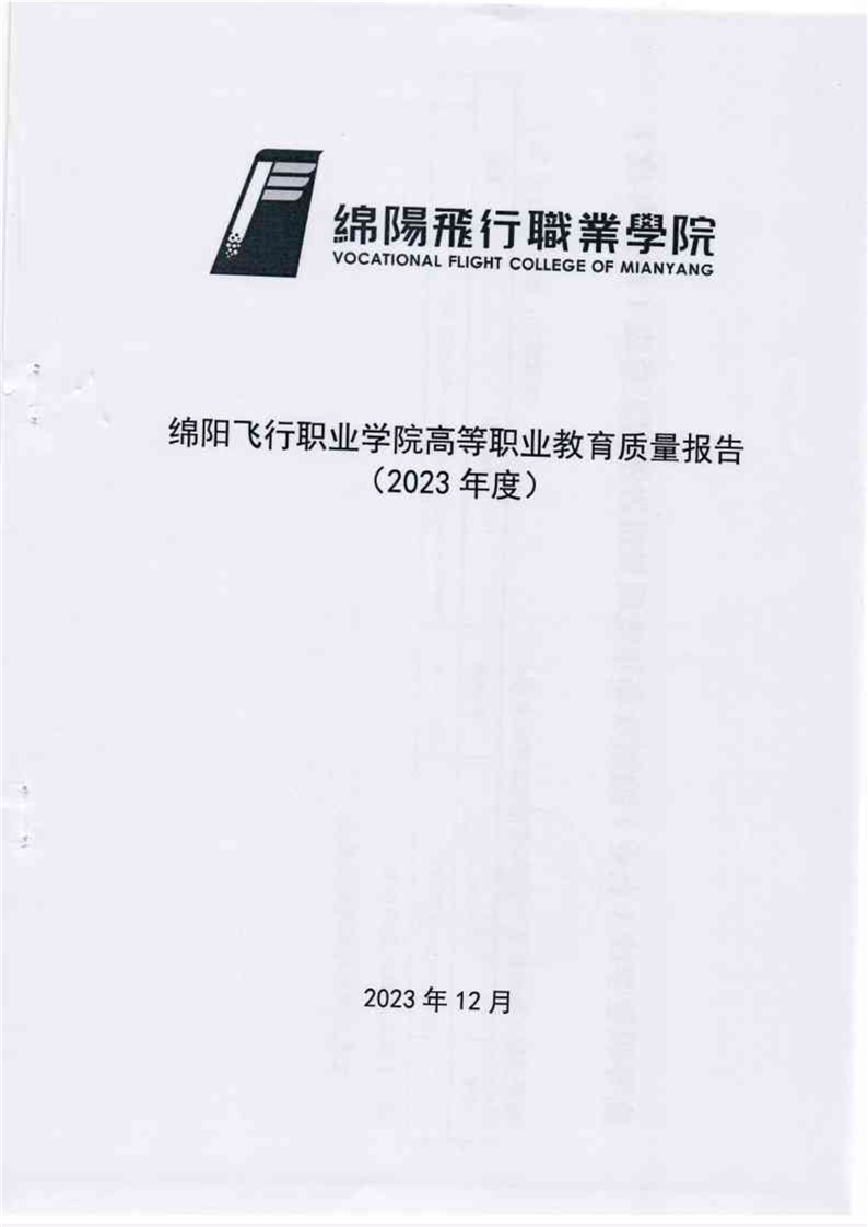 绵阳飞行职业学院有限公司关于报送《绵阳飞行职业学院高等职业教育质量报告(2023年度)》的报告