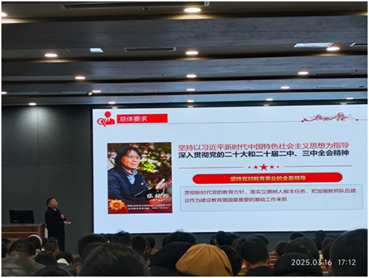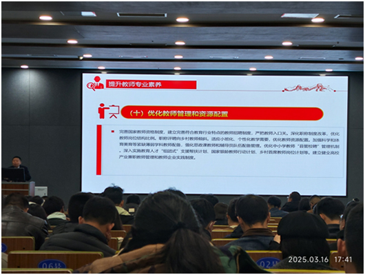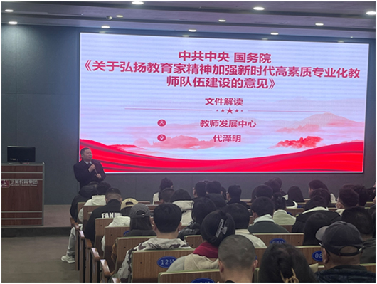 3月16日,绵阳飞行职业学院教师发展中心主任代泽明教授主讲了《关于弘扬教育家精神加强新时代高素质专业化教师队伍建设的意见》文件解读讲座,全体教师参加学习。本次培训围绕文件核心框架,结合学院办学实际,系统解读新时代教师队伍建设的战略要求,为加强教师队伍建设提供理论支撑与实践指引。