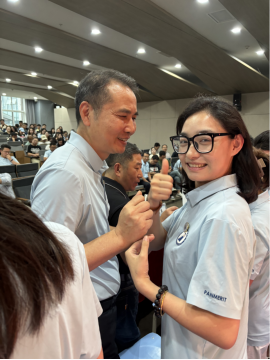 “青蓝协约”环节将仪式气氛推向高潮。舞台上,6位导师代表为青年教师代表佩戴刻有“绵飞院青蓝工程”字样的专属徽章——蓝色代表资深教师的沉稳与专业,青色象征青年教师的活力与潜力,两种颜色交织,寓意“青出于蓝而胜于蓝”。台下,其他导师也逐一为结对青年教师佩戴徽章,师徒眼神中满是信任与期许,相机定格下这一充满仪式感的瞬间。