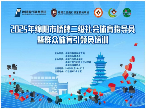 9月26日,2025年绵阳市桥牌项目二级社会体育指导员暨群众体育引领员培训开班仪式在绵阳飞行职业学院行政楼417会议室举行。本次培训由绵阳市教育和体育局、绵阳市体育总会主办,绵阳桥牌协会、绵阳飞行职业学院联合承办,旨在夯实桥牌项目推广基础,培育专业化体育指导力量。
