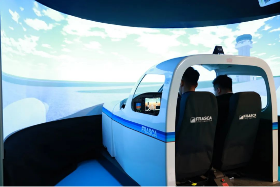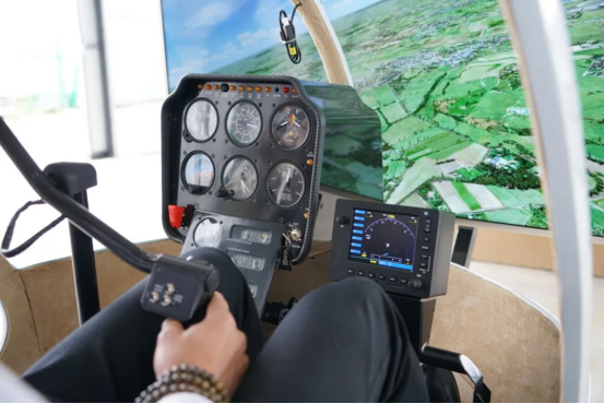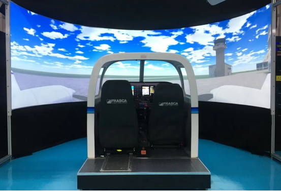 五级飞行训练器实训室位于实训楼一楼,中心面积192平方米,照明、空调、除湿、通信设备齐备。中心有一架PA-44和一架R44五级模拟训练设备。