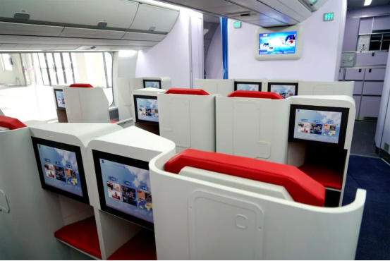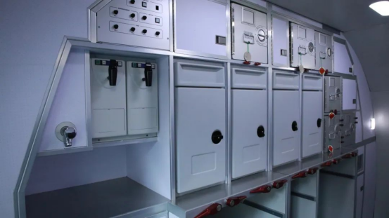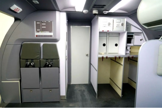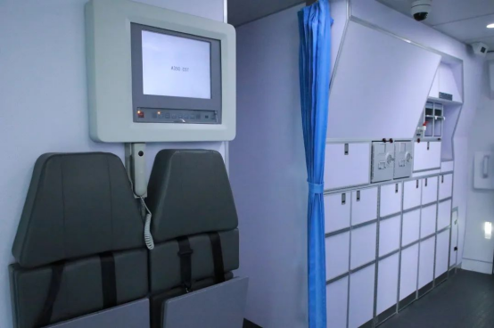 空客A350客舱服务训练模拟器模拟舱为双通道机型,共分为飞机1号门区段,公务舱段、经济舱段两部分。该模拟舱满足学生对FAP面板、ACP面板、AAP面板、AIP面板的操作和话机的使用。同时,方便学生对于双通道飞机的客舱布局和服务流程进行学习。教师还可通过两台液晶电视对学生的操作程序及服务语言和动作进行实时监控、指导。